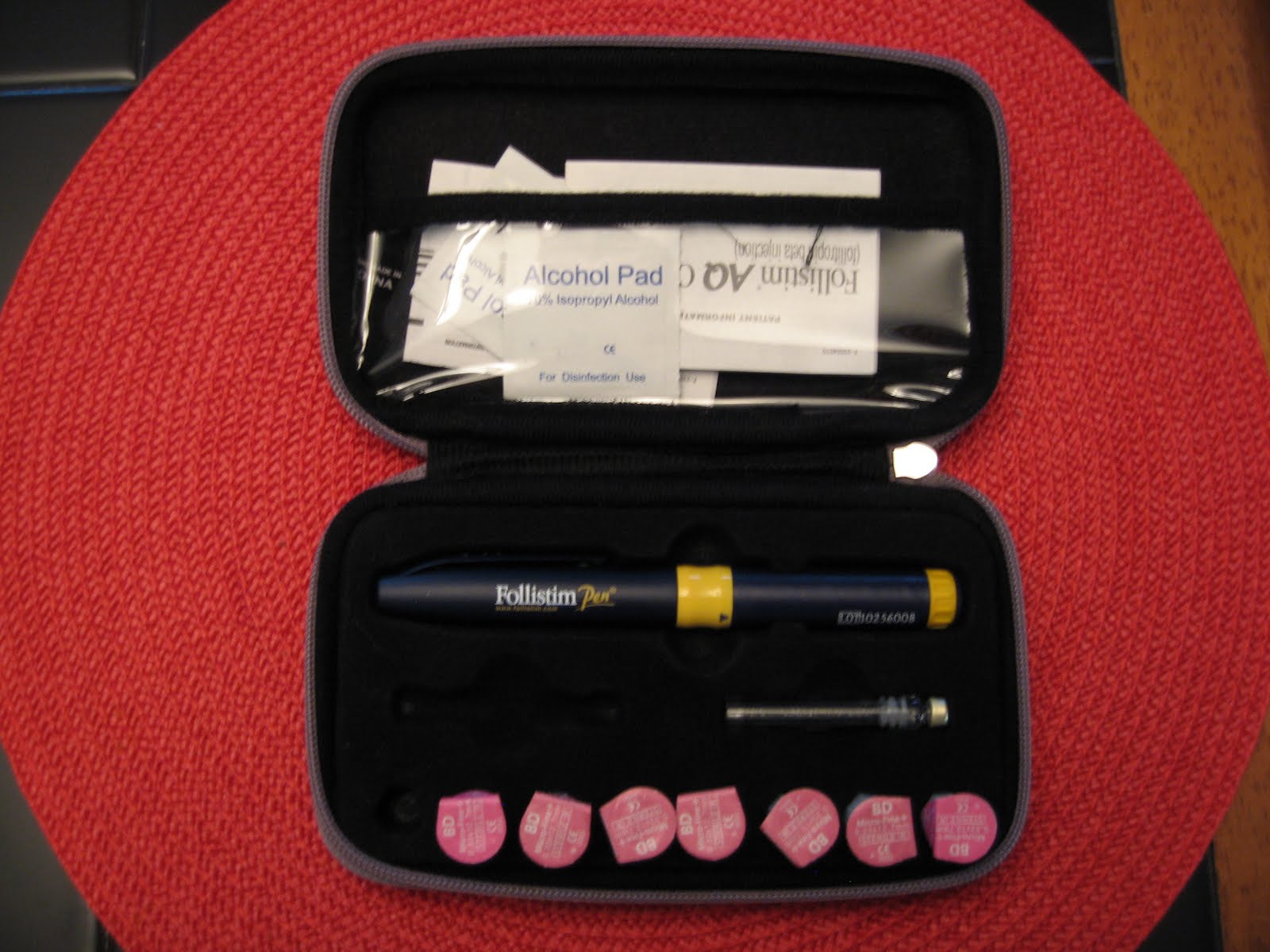 | The Follistim pen and way more tiny needles (the pink containers) than we will ever need. Note the handy carrying case! |